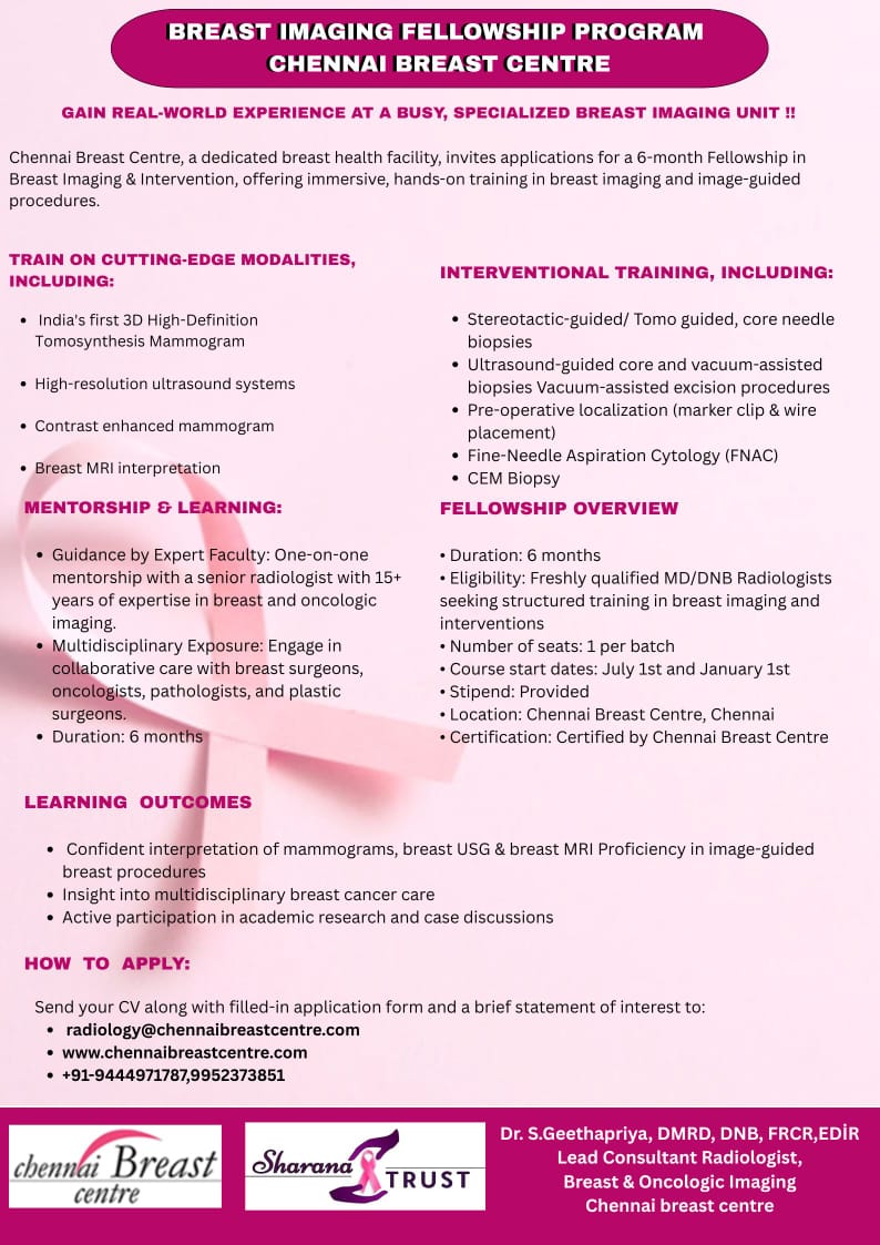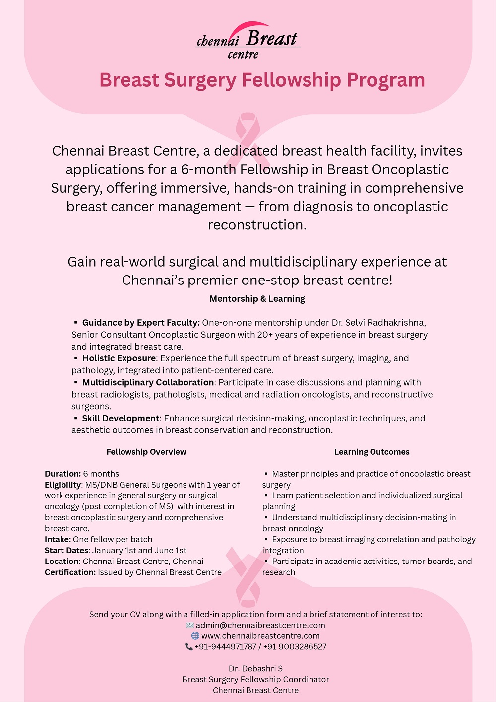 The senior faculty members ensure that Chennai Breast Centre’s fellowship programs deliver rigorous, specialty-focused training that prepares doctors for excellence in comprehensive breast care and leadership in their respective fields. Candidates are selected through Interview process. For more details, refer the brochures below.