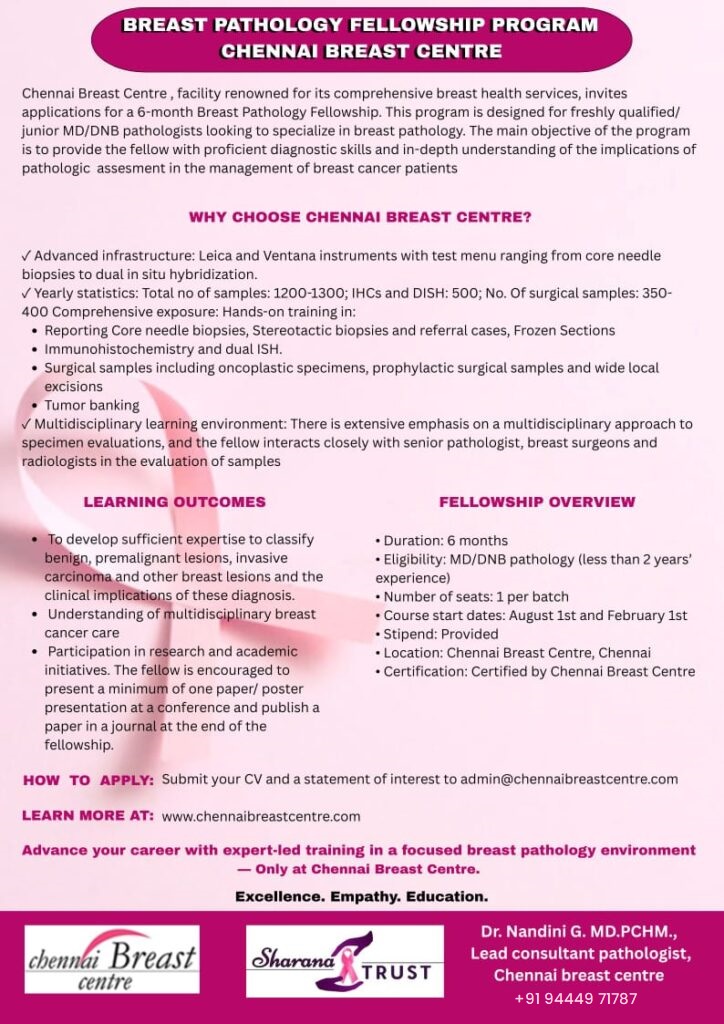 Dr. Nandini Govindarajan, Lead Pathologist at Chennai Breast Centre, heads the Breast Pathology Fellowship. With more than a decade of dedicated teaching experience, she has mentored a large cohort of pathology trainees. Her guidance offers fellows in-depth exposure to diagnostic breast pathology, multidisciplinary tumor board discussions, and the nuances of breast cancer biology.