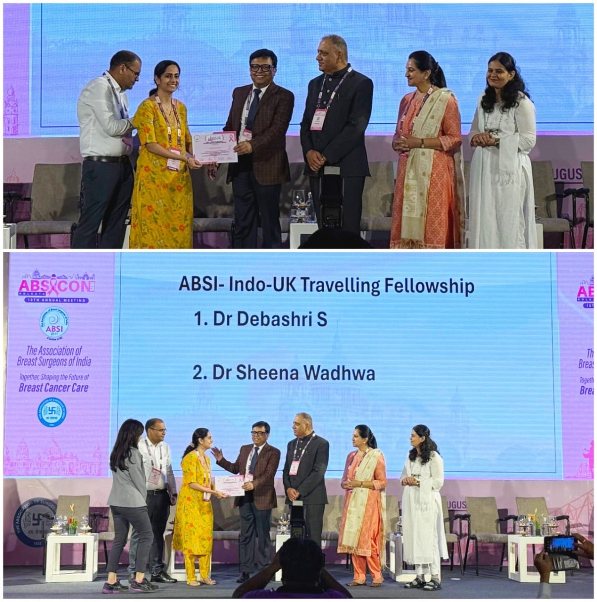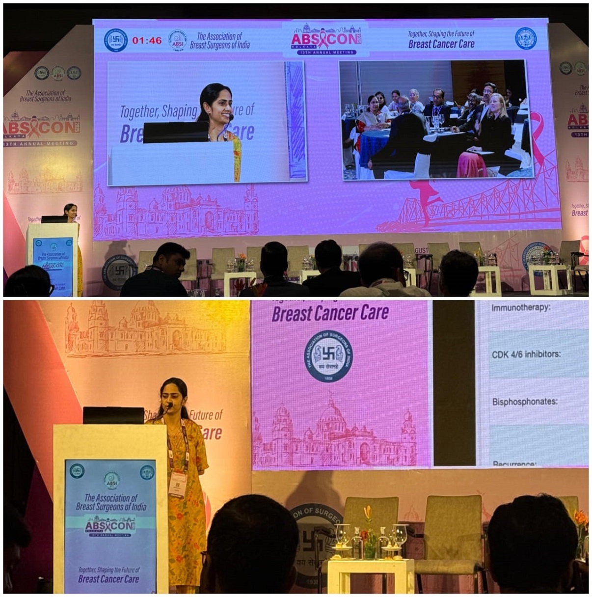Our team participated in ABSICON 2025 held in Kolkata. Dr. Selvi Radhakrishna delivered a lecture on the emerging possibility of omitting sentinel lymph node biopsy in breast cancer. The CBC team further conducted a hands-on workshop on the role of radiology in breast disease management, covering ultrasound-guided biopsies, clip and wire insertions, and aspirations. Dr. Debashri presented a poster and won the ABSI Indo-UK Travelling Fellowship Award for her work on Digital Dialogue in Oncology: Enhancing Collaboration through App-based MDTs. Dr. Saranya and Dr. Balapriya also presented posters at the same conference.